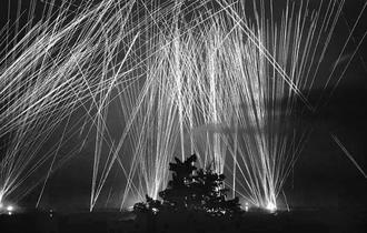 Der Himmel über Mannheim und Ludwigshafen in der Nacht vom 05. auf den 06. September 1943 - Über 80 Flakscheinwerfer leuchten den Himmel aus.