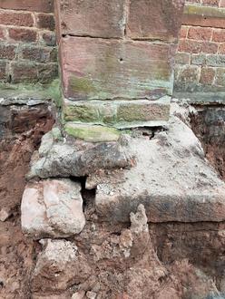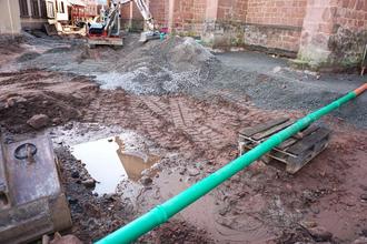 Die Baufirma war mit schwerem Gerät bei den Erdarbeiten zugange und verschonte mit der großen Baggerschaufel auch die historischen Mauern der ehem. Klosterkirche aus dem 14. Jahrhundert nicht. Besonders an den Stützpfeilern der einzelnen Joche hatte wohl die Baggerschaufel direkten „Kontakt“ mit den alten Steinen und so kam es, dass an einem Stützpfeiler ein Stein des Fundamentes ausbrach. Der Denkmalschutz wurde informiert und gleichzeitig auch die Rechtsabteilung der prot. Landeskirche mit der Folge des sofortigen Baustopps, sagte Pfarrer Martin Groß, der ebenfalls vor Ort war. Um möglichen zusätzlichen Schaden zu vermeiden, wurde mit Schotter die ausgebaggerte Fläche an der Kirchenmauer wieder verfüllt, damit kein Wasser in das Fundament eintritt oder die Mauern auf andere Art geschädigt werden könnten.
