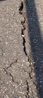 Auf dem Asphalt sichtbar sind Risse, die sich über mehrere Meter hinziehen und tief in den Unterbau der Sommerbergstraße reichen.