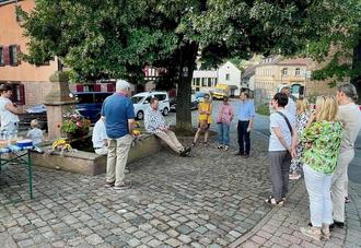 Lambrecht. (ve) Der Verkehrsverein Lambrecht hat es sich zur Aufgabe gemacht, die historischen Laufbrunnen in Lambrecht zu erhalten und sie nacheinander der Öffentlichkeit zu präsentieren. In diesem Jahr stand der Klosterbrunnen im Mittelpunkt des Brunnenfestes. Am frühen Samstagabend waren Interessierte der Einladung des Vereins gefolgt, um gemeinsam das Glas zu erheben und auf das Wohl des historischen Klosterbrunnens anzustoßen. Zuvor hatte Nachbarin Sabine Frey, die auch das Jahr über den Brunnen pflegt, mit einem Sonnenblumen-Arrangement den Brunnen festlich geschmückt.