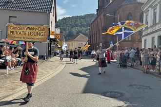 Den krönenden Abschluss des Umzugs bildeten die Männer und Frauen des „Glencairn Whisky-Club Weidenthal“, die in schottischen Outfits, begleitet von schwingenden Fahnen und Dudelsackklängen sowie vom ersten Pfälzer Whiskykönig Mc Herbie I., einen farbenfrohen und stimmungsvollen Ausklang boten.