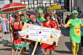 „Süße Früchte von Baum und Strauch, geben uns uns Power – euch auch? Die Step-Aerobic-Gruppe sorgte mit ihrem Slogan und als süße Früchtchen verkleidet für viel Aufmerksamkeit.