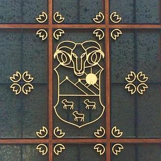 Ein kunstvoll gearbeitetes Ziergitter mit Wappenmotiv schmückt die Haustür in der Schulstraße 5
