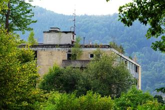 Auf dem Weg in Richtung Westen taucht die Awo-Ruine aus dem grünen Blätterwald der Bäume auf.