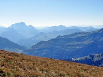 War es anfangs noch ein breiter Weg zweigte man von diesem kurz oberhalb des Speichersees ab und folgte der Pfad-Markierung weiß-rot-weiß ansteigend zum Gipfel vom „Hohen Licht“ (2009m). Weiter bergauf, dem Grad folgend, ging es auf den Hochblanken (2068m). Auf dem großzügigen Hochplateau konnte man die großartige Aussicht auf die Bregenzer-Bergwelt bis zum Bodensee genießen. Der Blick reichte hinüber zum Hohe Ifen und dem Widderstein im Kleinwalsertal, zu den Lechtaler Bergen, zu den Bergen der Silvretta bis zum Piz Buin mit 3312m der höchste Berg von Vorarlberg. Aber auch die Verwallgruppe, der Rätikon mit der Schesaplana und schlussendlich der Säntis in der Schweiz konnte von hier gesehen werden.