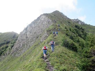 Auch am Samstag startete der Wandertag umweltbewusst mit dem Landbus. Kurz vor halb neun in der Früh fuhr man von Damüls aus auf das Faschinajoch. Mit dem Doppel-Sessellift der Stafelalpbahn schwebte man dann hoch zur Bergstation Stafelalpe auf 1865 Meter. Von hier ging es über einige Steilstufen, zum Teil mit Seilen versichert, hoch zum Gipfel des Glatthorn auf 2134m. Der freistehende Gipfel bot, schon wie in den Tagen zuvor, der Gruppe eine atemberaubende Aussicht. Nachdem man sich satt gesehen hatte, machte man sich auf den kniffligen Abstieg. Über eine längere Passage ist der Abstiegsweg ebenfalls seilversichert und erleichtert so etwas den Abstieg. Trotzdem war volle Konzentration gefordert und jeder Schritt musste gut überlegt sein. Als man wieder in sicherem Gefilde angekommen war, ließ man sich erst einmal im Gras nieder und gönnte sich eine Verschnaufpause. Danach ging es weniger schweißtreibend weiter bergab zur „Franz Josef Hütte“. Auf der großzügigen Terrasse der Hütte belegte man die noch letzten freien Sitzgelegenheiten in der Sonne und nahm den einen oder anderen Schluck bzw. Bissen zu sich. Nach der ausgiebigen Rast führte der Weiterweg vorbei an der Stafelalpe hinunter nach Faschina. Auf der „Hahnenköpfle Galerie“ (tunnelähnliches Bauwerk zum Lawinenschutz zwischen Damüls und Faschina) marschierte man dann zurück nach Damüls zur Unterkunft.