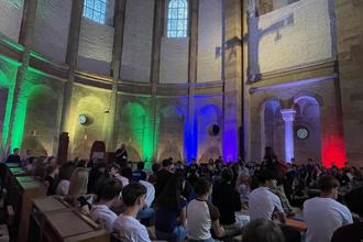 Nach einer kleinen Snackpause stand Bischof Dr. Karl-Heinz Wiesemann umringt von den anwesenden Jugendlichen in der Apsis den mitgebrachten Fragen Rede und Antwort. Zum Abschluss feierten alle einen eindrucksvollen Gottesdienst, bei dem auch das Smartphone seinen Platz haben durfte.