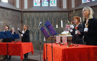 Der Festgottesdienst bereichert wurde durch den Gesang des Gesangvereins 1846 e.V. Lambrecht, der in diesem Jahr sein Jubiläum zum 175jährigen Bestehen gefeiert hatte, mit dem Lied „Herr meine Güte“ und „Irische Segenswünsche“. Eine Besonderheit stellte der Beitrag des Handglockenchors Karlsruhe mit „Lament“, „Joyful Proclamation“ und „Remembrance“ dar. Jede der Spielerinnen bediente mehrere Glocken aus Bronze, die in der Länge des Notenwertes zum Schwingen gebracht und anschließend wieder einfühlsam abgedämpft wurden, um einen ausdrucksvollen Gesamtklang zu erzeugen. Die Orgel zum Festgottesdienst spielte Simone Weber. Ein großer Applaus der Festgottesdienstbesucher galt allen Mitwirkenden.