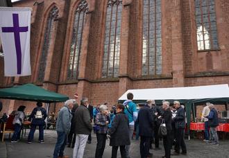 Vor der Kirche bestand ein umfassendes Angebot zum „Essen und Trinken“, geöffnet war auch das Gemeindehaus mit „Kaffee und Kuchen“. Holzklötzchen standen bereit, um den „höchsten“ Kirchturm aufzusetzen, was man schon immer einmal vom Kirchturm herunterrufen wollte, konnte man auf Kärtchen aufschreiben und schließlich war auch eine Kirchturmführung möglich, allerdings konnten jeweils nur fünf Personen angesichts der engen Platzverhältnisse teilnehmen.