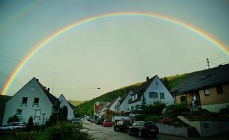 Ein besonderes „Prachtexemplar“ von Regenbogen war am frühen Montagabend zu sehen, als nach dem Gewitterschauer die Sonne wieder schien und der Regenbogen als atmosphärisch-optisches Phänomen am dunklen Abendhimmel stand. An der Außenseite ist der Regenbogen rot, darauf folgt Orange, Gelb, Grün, Blau und Violett mit fließenden Übergängen. Schwach war noch ein Nebenregenbogen zu erkennen.