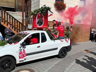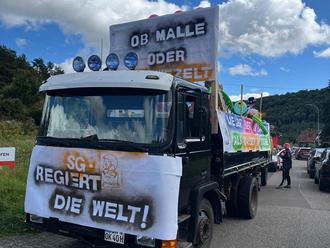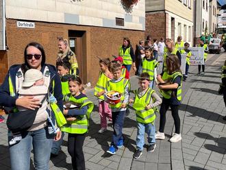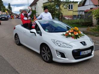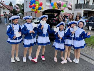 Im Anschluss zog der bunte Kerweumzug durch die Straßen des Dorfes und brachte Stimmung und Farbe ins Ortsbild. An der Spitze fuhren Bürgermeister Rene Verdaasdonk und Kerwepräsident Marvin Moser stilecht im Cabriolett, gefolgt von der Kerwejugend. Auf dem zweiten Wagen fuhren die Beigeordneten Annette Aull mit Hund Lina und Felix Heller.