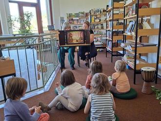 Mit Hilfe eines Kamishibais (Erzähltheater) lasen Tina und Ulrike die Geschichte von Benno Bär und seinem Brummdidum vor. Ein kleiner Zuschauer wurde von den bunten Bildern so inspiriert, dass parallel zu der eigentlichen Geschichte noch eine frei vorgetragene Bildbeschreibung zu hören war.