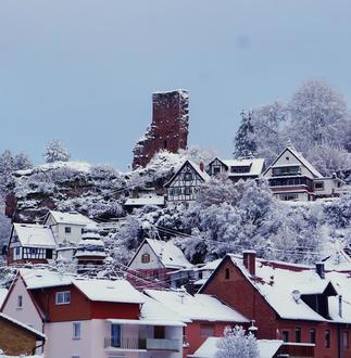 Elmstein mit seiner Burgruine am Tag „als der Schnee kam“.