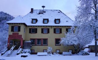 Tief verschneit zeigte sich auch das Elmsteiner Rathaus mit dem Relief des „Jägers aus Kurpfalz“ am Eingang.
