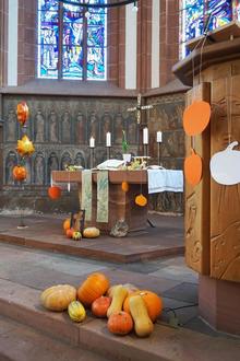 Der Chorraum der ehem. Klosterkirche in Lambrecht war zum Erntedanktag mit Kürbissen geschmückt.