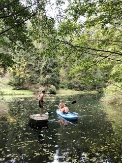 Jugendliche beim fröhlichen paddeln an einem außergewöhnlich warmen Oktobertag (3. Oktober 2023) auf dem Badeweiher der Geiswiese.