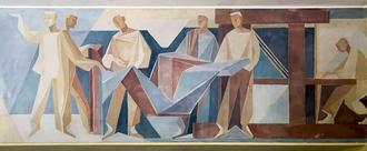 Das zweite Wandgemälde, das uns Silvia Zillich aus Lambrecht fotografiert hat, befindet sich ebenfalls in der ehemaligen Bahnhofsvorhalle. Dargestellt ist eine Szene aus der Tuchmacher-Geschichte: das Weben eines Tuches am Handwebstuhl sowie der anschließende Handel und Verkauf der Tuchwaren.