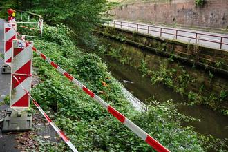 Der Rad- und Fußweg Neustadt-Lambrecht in Höhe der Einfahrt zum Krankenthal wird an der Böschung zum nahen Speyerbach weiter nur durch ein Flatterband gesichert sein. Das bisherige Holzgeländer als Absturzsicherung war marode geworden und hatte seinen Halt an der steilen Böschung zum Speyerbach verloren, die zudem teilweise abgerutscht ist. Verbandsbürgermeister Gernot Kuhn teilte mit, es sei bisher nicht gelungen, eine Firma zum Errichten eines Geländers zu finden, zumal die Geländerstützen eingerammt werden müssten. An der dortigen engsten Stelle des Tales liegen Radweg, Speyerbach und Bundesstraße dicht beisammen.