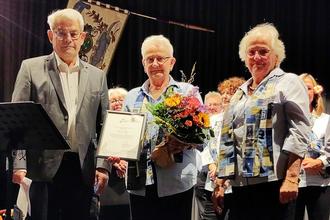 Ortrud Rey singt seit 40 Jahren im Verein, erst in Lindenberg jetzt in Lambrecht. Herbert Baßler, Vorstandsmitglied im Kreischorverband Vorderpfalz überreichte die Urkunde des Chorverbandes der Pfalz und würdigte die vollbrachte Leistung.