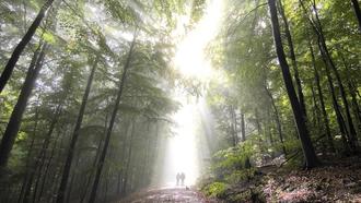 Die eindrucksvollen Lichtstrahlen, die sich durch das dichte Blätterdach brechen und den Weg in warmes, goldenes Licht tauchen, fangen die besondere Atmosphäre des Pfälzerwaldes perfekt ein.