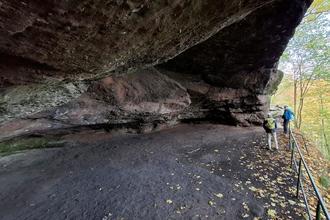 Am Westfels angekommen bot sich den Wanderern ein, wenn auch durch den Baumwuchs etwas beeinträchtigt, toller Ausblick. Man blickte über den westlichen Pfälzerwald in Richtung Kaiserslautern und in nördlicher Richtung ins „Nordpfälzer Bergland“ mit dem höchsten Punkt der Pfalz dem Donnersberg. Nach einer kurzen Verweildauer am Aussichtspunkt ging es auf dem „Gratpfad“ hinüber Richtung Südfels. Kurz vor Erreichen des Südfels stattete man noch der „Drachenhöhle“ einen Besuch ab. Die Höhle liegt auf der östlichen Seite des Buntsandsteinmassivs und ist über einige Steinstufen, gesichert mit einem Geländer, zu erreichen. Nach Besichtigung der Höhle, ohne Drachen, ging es dann weiter zum Südfels.
