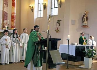 Begrüßung der Besucher durch Kaplan Praveen Isukupalli