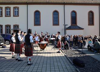 Stefan Brand, musikalischer Leiter der Band, hatte eine sorgfältige Auswahl an Liedern getroffen, die den keltischen Geist und die traditionelle schottische Musik perfekt einfingen. Die Dudelsäcke wurden begleitet von Brassinstrumenten, Trommeln und Kesselpauken, was die Zuhörer auf eine klangliche Reise mitnahm. Neben Klassikern wie „Scotland the Brave“, „Mull of Kintyre“, „Loch Lomond“, „Amazing Grace“ und „Auld lang Syne“ wurde auch das imposante „Highland Cathedral“ gespielt. Die Gäste lauschten interessiert den Erklärungen des Pipe Major's zu den einzelnen Musikstücken und genossen die einzigartige Darbietung.