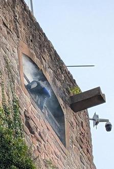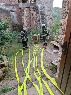 Aus dem Fenster des Gewölbekellers der Oberburg drang Rauch nach außen, Besucher waren eingeschlossen und warteten auf Rettung. Die Freiwillige Feuerwehr Lambrecht rettete die Wanderer aus dem verrauchten Gewölbekeller.