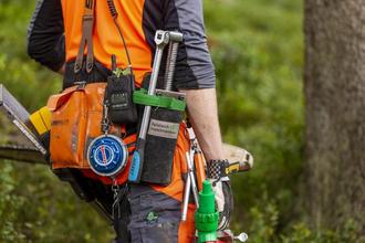 Forstwirt auf dem Weg zu Baumfällarbeiten