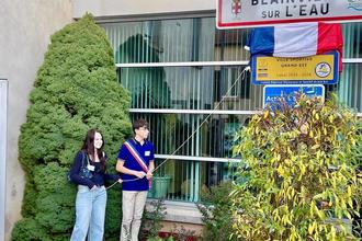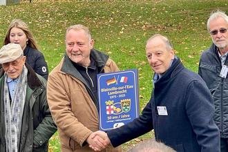 Enthüllung des Schildes „50 Jahre Jumelage“ durch Viktoria Zillich (Lambrecht) und Craig Vautrin (Blainville)