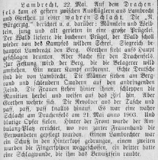 Lambrecht, 22. Mai. Auf dem Drachenfels kam es gestern zwischen Ausflüglern aus Lambrecht und Grethen zu einer wahren Schlacht. Die „A. Bürgerzeitg.“ „ berichtete u.a. darüber: Männlein und Weiblein, jung und alt gerieten in eine große Prügelei. Der Wald lieferte die buchenen Prügel, der Wald scholl wieder von des Kampfes wildem Schrei. Siegreich behauptet Lambrecht den Berg. Grethen steht aufs Haupt geschlagen drunten. Aber Rache für den Drachenfels. Zur Festung wird der Berg, die die Belagerer wild umstehen. Ein neuer Kampf entbrennt. Echte Deutsche sind die von Lambrecht. Die Männer stehen am Bergrand und schleudern Quardern auf den andringenden Feind. Die Frauen stehen hinter ihnen, schleppen die Munition herbei und weisen auf das Ziel hin. Aber Grethen wehrt sich. Die Revolver aus der Tasche und paff, paff, paff knallts hinauf. Es war eine wahre Schlacht am Drachenfels am 21. Mai anno 1903. Und blutige Opfer fielen. Hinter der Front wurde der Ambulanzplatz errichtet, wo von zarter Frauenhand die Verwundeten gepflegt wurden. Einem Lambrechter war ein Schuß in den Hinterkopf gedrungen, einem zweiten wurden die Fingerspitzen wegeschossen, ein dritter hatte eine Schlagwunde, die ihm das Bewußtsein raubte.