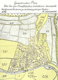 Die Altstadt von Lambrecht mit ihren Straßen und Gebäuden ist zu großen Teilen bis heute erhalten. Die Plan-Aufnahme zeigt den Ortsbereich von Lambrecht im Jahre 1750 anlässlich der damaligen Grundsteuer-Renovation.