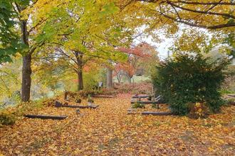 Ein stiller Zauber liegt über dem Esthaler Friedhof. Die Bäume tragen ihr Herbstkleid in leuchtendem Gelb und sanftem Rot, als wollten sie noch einmal in voller Pracht erstrahlen, bevor der Winter Einzug hält. Lautlos sinken die Blätter herab und weben einen goldenen Teppich, der die Ruhestätten zart bedeckt – friedlich, vergänglich und doch von zeitloser Schönheit.