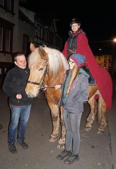 Dem Martinszug voran trabte das Pferd mit St. Martin im roten Mantel hoch zu Ross (Tanija Göbel), geführt von Matthias Blitt und Tochter Karina.