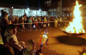 Im Hof der Feuerwehr brannte bereits das Martinsfeuer, als die Kinder, Eltern, Großeltern und Verwandten hier eintrafen. Die Kinder erhielten ihre Martinsbrezeln, die Feuerwehr sorgte für das leibliche Wohl der Teilnehmer.