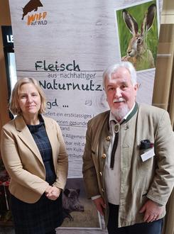 Peter Seelmann, Vorsitzender des Jagdaufseherverbandes Rheinland-Pfalz e.V. im Dialog mit Klimaschutzministerin Katrin Eder.