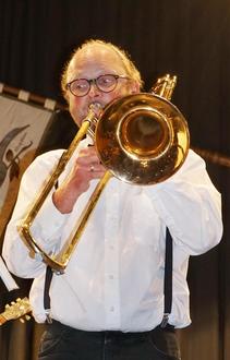 Eine besondere Ehrung und Verabschiedung ließ die TC-BigBand ihrem „Alterspräsidenten“ Ernst Burger zuteil werden. Der Klarinettist gehört zu den Gründungsmitgliedern der BigBand im Jahre 1975 und der 88jährige hatte jetzt mitgeteilt, dass der Auftritt in Lambrecht sein letzter in der TC BigBand sein sollte. Blaus Brick hatte ihn würdig verabschiedet.