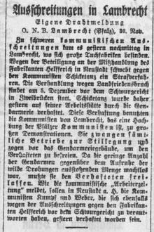 Zu schweren kommunistischen Ausschreitungen kam es gestern nachmittag in Lambrecht, wo sich große Tuchfabriken befinden. Wegen der Beteiligung an der Mißhandlung des Fabrikanten Helffrich in Neustadt schwebt gegen den Kommunisten Schicketanz ein Strafverfahren. Die Behandlung wegen Landfriedensbruch findet am 5. Dezember vor dem Schwurgericht in Zweibrücken statt. Schicketanz wurde daher gestern auf seiner Arbeitsstätte durch die Gendamerie verhaftet. Diese Verhaftung benutzten die Kommunisten von Lambrecht, das eine Hochburg der Pfälzer Kommunisten ist, zu großen Demonstrationen. Sie zwangen sämliche Betriebe zur Stillegung und zogen vor das Genarmeriegebäude, um den Verhafteten zu befreien. Da die geringe Anzahl der Gendarmen gegeüber dem Aufruhr der wilde Drohungen ausstoßenden Menge machtlos war, mußte sie den Verhafteten freilassen. Wie die kommunistische „Arbeiterzeitung“ meldet, sollen in Neustadt a.H. die kommunisten Kumpf und Weber, die sich ebenfalls wegen der Ausschreitungen gegen den Fabrikanten Hellfrich vor dem Schwurgericht zu verantworten haben, gestern verhaftet worden sein.
