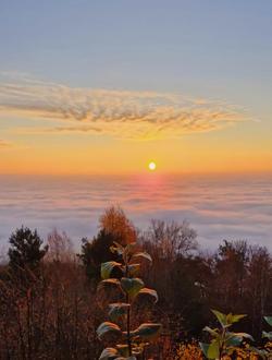 Der Anblick könnte glatt von einer Urlaubsreise stammen: ein Sonnenaufgang über dem Meer. Doch was hier leuchtet, ist kein Wasser – es ist ein Wolkenmeer, aufgenommen von der Kalmit auf 674 Metern, dem höchsten Berg des Pfälzerwaldes.