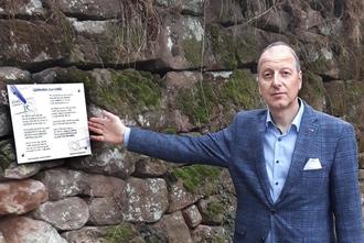Andreas Ohler zeigt das Gedicht „Gedanken zur Wahl“ auf dem Krankenthaler Weg in der Gemarkung Bohnenäcker