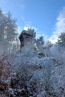 Der Dicken-Stein-Turm in Lambrecht zeigt sich nach dem ersten Kälteeinbruch in einer zarten Winterstimmung. Feiner Raureif überzieht Felsen und Sträucher, während der Turm über der frostigen Landschaft trohnt und in den klaren Himmel ragt.