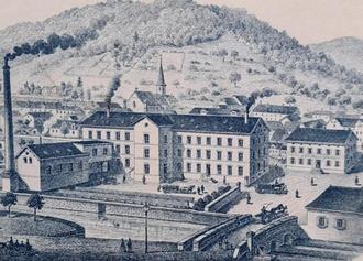 Diesmal zeige ich keine Postkarte und auch keine Fotografie, sondern ein Bild auf einer alten Rechnung der Tuch- & Buckskin-Fabrik F. Waltzinger Söhne aus dem Jahr 1896. Die detailreiche Zeichnung bietet eine besondere Perspektive auf die Fabrikgebäude und die alte Speyerbachbrücke.