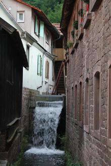 Wasserabsturz des Speyerbachs während des Hammerwerksbetriebs. Über den Mühlkanal wurden früher fünf Wasserräder versorgt.