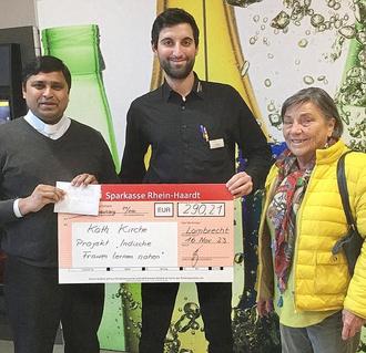 Kaplan Praveen Kumar Isukupalli schreibt: „Der Lebensmittelmarkt SBK in Lambrecht unterstützt seit Jahren soziale Projekte in den Talgemeinden, aber auch weiter entfernt, in Indien. Über drei Monate wurden die Pfandbons, die Kunden spendeten, für mein soziales Projekt gesammelt. Sie alle haben mit dem Verzicht auf die Rückgabe des Leergut-Pfandes zu dem großen Erfolg beigetragen. So kam die Summe von 290,21 € zusammen. Die Marktleitung des SBK hat mir einen obligatorischen Scheck mit dieser stolzen Summe überreicht.