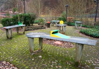 Die Pit-Pat-Anlage, eine Mischung zwischen Billard und Minigolf, wird auf Tischen gespielt, die mit einem Rollstuhl unterfahrbar sind.