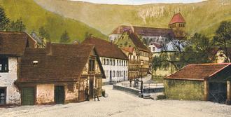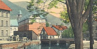 Die Ansichtskarte ist gelaufen im Jahr 1906 und zentral blickt man auf die alte Walkmühle.