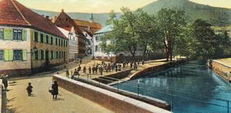 Neugierig habe ich mich auf die Suche nach weiteren Bildern gemacht, um mehr über das Aussehen der Mühle aber auch von der alten Brücke zu erfahren. Dabei habe ich drei weitere Bilder auf Ansichtskarten gefunden, auf denen auch die Walkmühle an der Speyerbachbrücke zu sehen ist. Eine Walkmühle gab es an dieser Stelle schon sehr lange. Die Stadtchronik erwähnt ein „Registre appartenant à la follerie du pont“, das eine Abrechnung von 1599 enthält, in der von einem Stück Tuch die Rede ist, das zur Walkmühle an der Brücke gebracht wurde. Übersetzt heißt der Name des Registers: „Register, das zur Walkmühle an der Brücke gehört“.