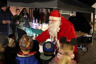 Mit Einbruch der Dunkelheit folgte der Höhepunkt: Der Weihnachtsmann fuhr auf einem hell beleuchteten Trike auf den Dorfplatz. Die Kinder empfingen ihn voller Vorfreude, und die Freude war groß, als er Süßigkeitentüten an die kleinen Besucher verteilte.