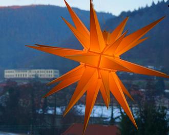 Das weihnachtliche Bild mit dem leuchtenden Stern vor dem schemenhaften Hintergrund des Verbandsgemeinde-Verwaltungsgebäudes soll nach Jahren der Schuldenanhäufung nun eine Wende zur positiven Entwicklung der Verbandsgemeinde Lambrecht versinnbildlichen.