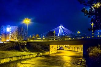 Was ist sichtbar an diesem Foto? Mich fasziniert das Farbenspiel dieses Fotos von Dr. Leube aus Ludwigshafen, das Motiv kennen sicher einige von Ihnen von Besuchen von Ludwigshafen her: Ein nachtiefblauer Himmel, der sich genauso auszuspannen scheint wie der dahinter liegende Pylon der Autobrücke zwischen Ludwigshafen und Mannheim. Die wie Spinnenfäden auf die davorliegende andere Brücke darniederfahrenden Stahlseile verleihen dem Ganzen zusätzliche Stabilität, sie tragen die Brücke und strahlen zugleich aus und scheinen die Erde festzuhalten. Der Kopf des Pylonen verweist in den nachttiefblauen Himmel.